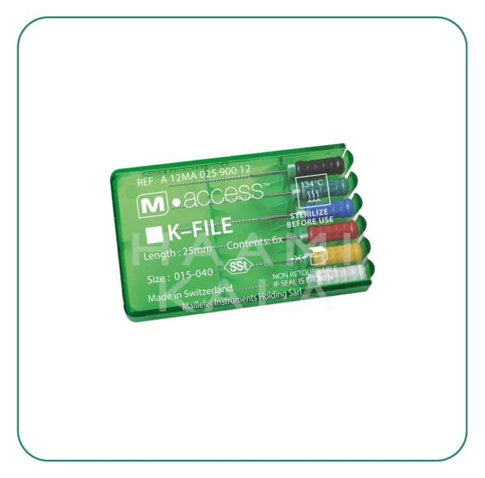 - K-File یک فایل دستی از جنس Stainless Steel است که برای یافتن کانال ها و ایجاد Glide Path استفاده می شود